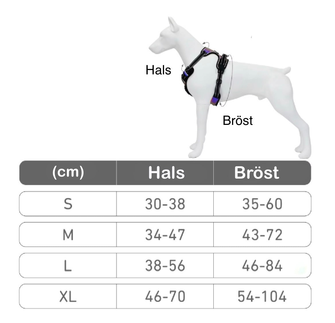 Mät omkretsen för hals respektive bröst enligt bild. I situation av att din hund befinner sig nära två storlekar, ha i åtanke att större storlekar kan har kraftigare band i tillägg till ett större parti av tyg som selen består av